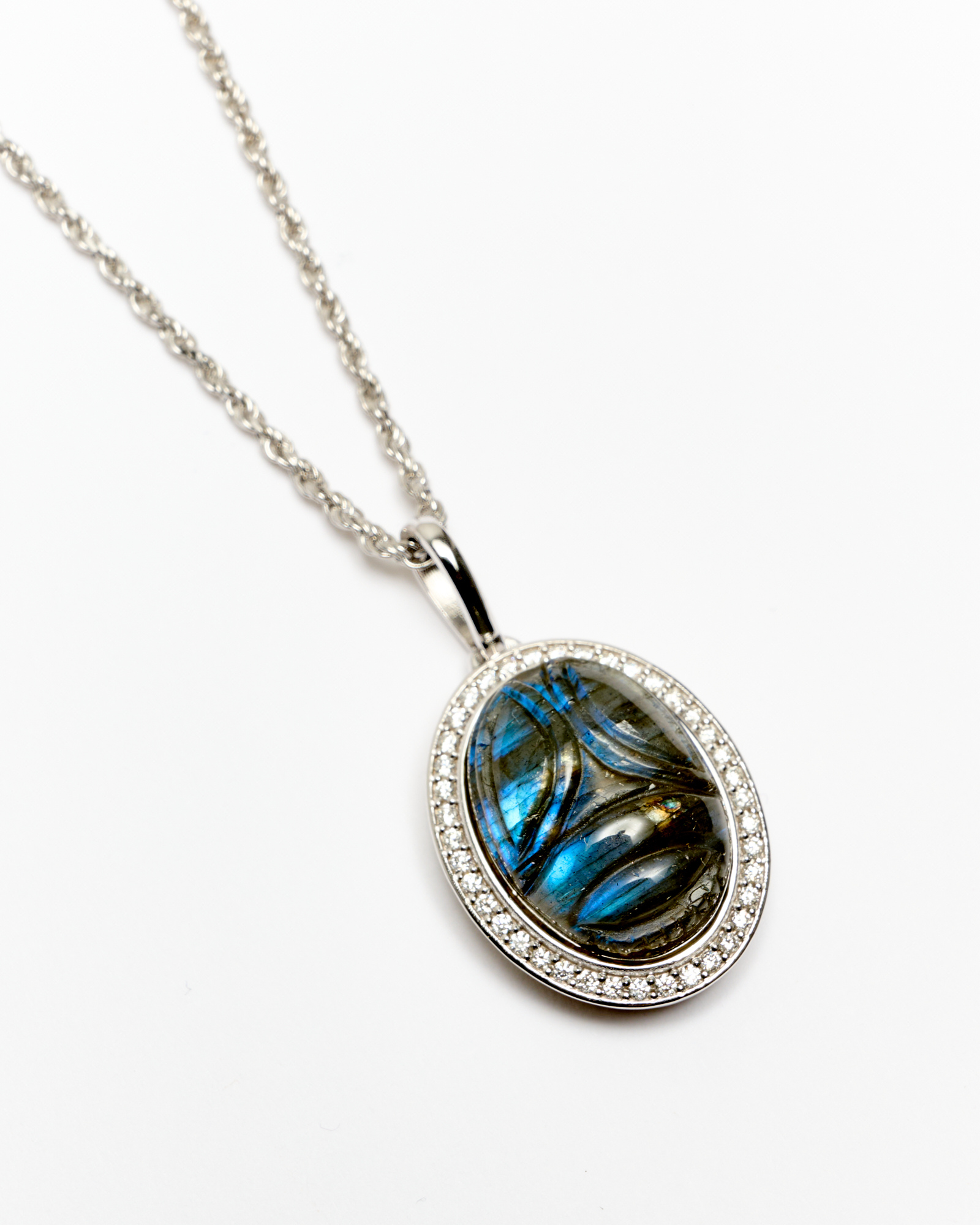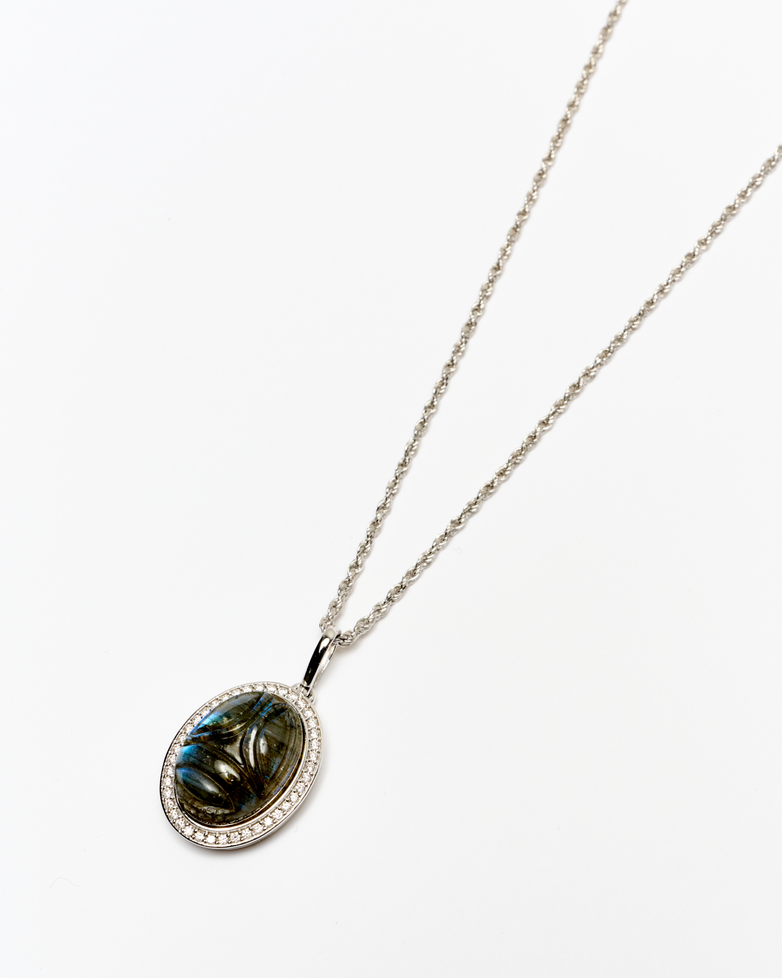 PENDENTIF EN OR BLANC 18CT SCARABÉE EN LABRADORITE ET DIAMANTS